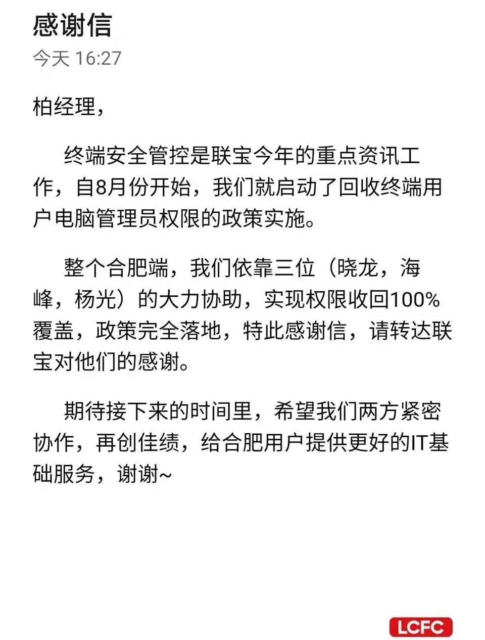 今年8月份,联宝公司启动回收终端用户电脑管理员权限的政策实施。该项目涉及合肥联宝工厂、联想科技港的研发部、深圳和广州联宝以及台北联宝的所有办公笔记本的管理员权限的回收。多多28委派王晓龙、王海峰、杨光三位技术工程师驻场协助,负责合肥地区大概2千台的办公机的管理员权限的回收。