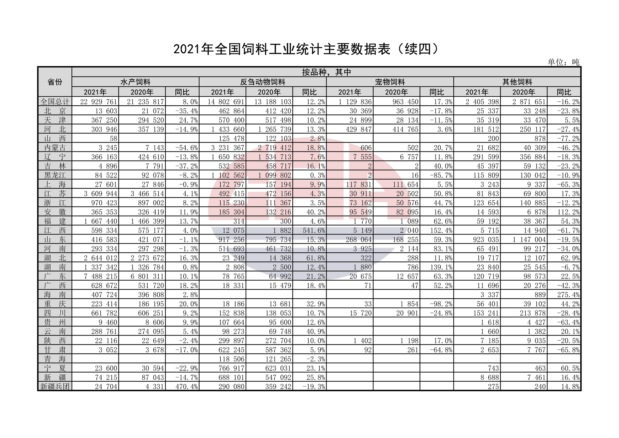 全国工业饲料总产量29344.3万吨,比上年增长16.1%。其中,配合饲料产量27017.1万吨,增长17.1%;浓缩饲料产量1551.1万吨,增长2.4%;添加剂预混合饲料产量663.1万吨,增长11.5%。分品种看,猪饲料产量13076.5万吨,增长46.6%;蛋禽饲料产量3231.4万吨,下降3.6%;肉禽饲料产量8909.6万吨,下降2.9%;反刍动物饲料产量1480.3万吨,增长12.2%;水产饲料产量2293.0万吨,增长8.0%;宠物饲料产量113.0万吨,增长17.3%;其他饲料产量240.5万吨,下降16.2%。