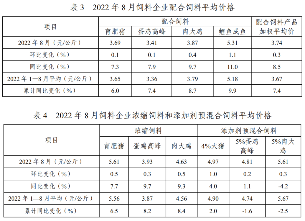 2022年8月,主要配合饲料、浓缩饲料、添加剂预混合饲料产品出厂价格环比以增为主。由于主要原料价格与去年同期相比仍处高位,推动配合饲料、浓缩饲料产品出厂价格同比继续增长。